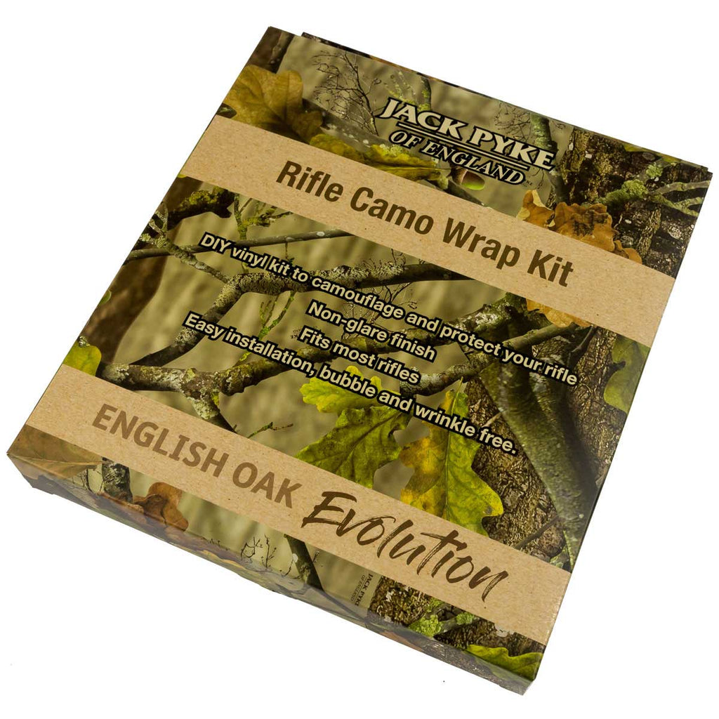 The kit is self adhesive and is applied easily using a moderate heat. The kit's camouflage is Jack Pyke's English Oak Evolution, a camo that perfectly replicates a woodland setting and breaks up the outline of whatever it is applied to.