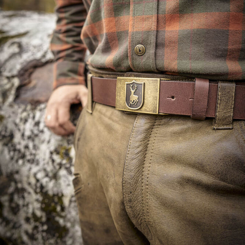 Deerhunter Leather Belt is beautifully made from 100% Full grain leather which is buttery soft and strong. The belt is fitted with a matte gold buckle and embossed with Deerhunter branding for an authentic finish. A genuine leather belt is a must have for your hunting wardrobe and can be worn with all your favourite trousers. 115cm Long