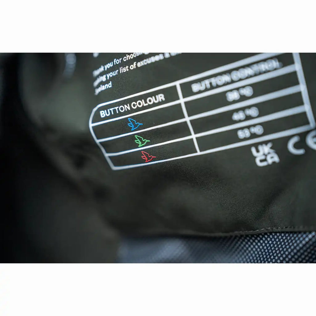 • Adjustable heat levels with easy chest-button control and colour indicators