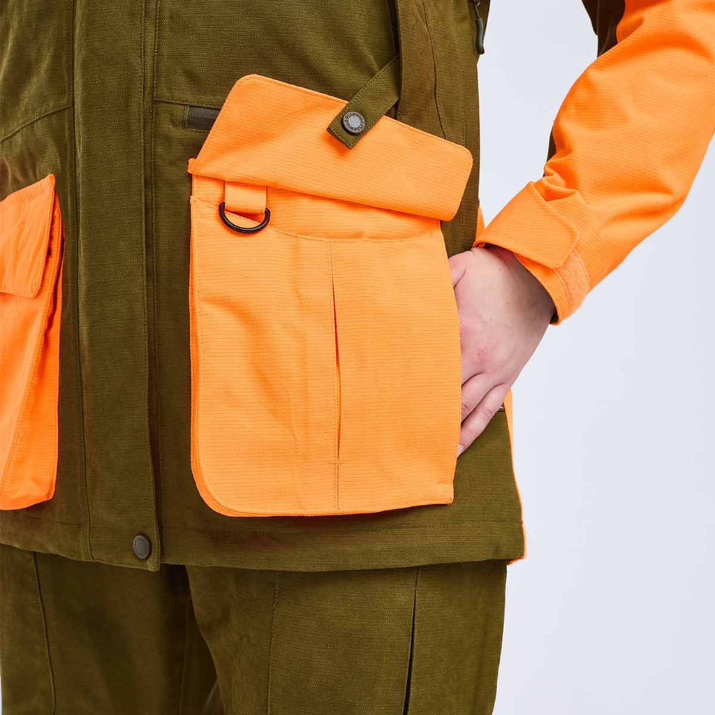 Available in olive green and olive green & orange, and in sizes XS–XXL (UK8-18), this jacket offers a perfect fit for every outdoorswoman. Practical features include fleece-lined handwarmer pockets, dual radio pockets, a GPS pocket, and a right-side game pocket, with magnetic-flap front pockets, a clever button loop, a D-ring, and secure inner pockets for valuables.