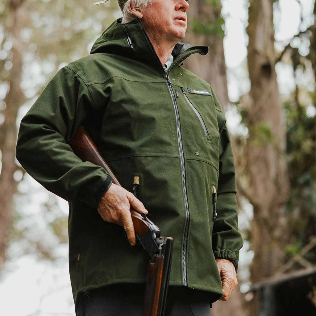 • Men’s hunting jacket; 100% windproof, waterproof, breathable .